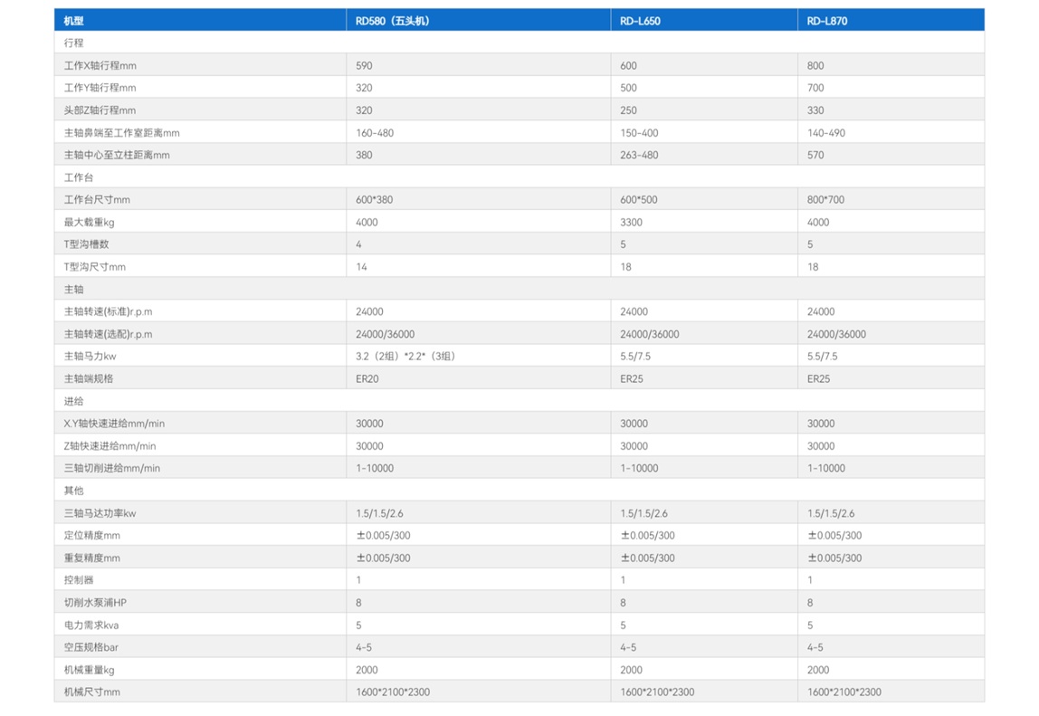 The RD Series, including RD580 (5-head model), RD-L650, and RD-L870, are high-performance engraving and milling machines ideal for precision manufacturing. Featuring 24000-36000 rpm high-speed spindles (optional 36000 rpm) and linear guides on three axes, they deliver exceptional speed (30000 mm/min rapid feed) and accuracy (±0.005 mm/300 positioning/repeatability).